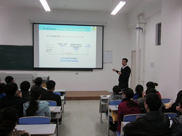 师彦平研究员首先结合自己实验室的工作概括介绍了基于液相色谱等分析手段的样品前处理的研究背景及其研究意义,特别提出了新材料新技术在样品前处理中的重要地位,然后详细介绍了包括利用二氧化硅、二氧化锆等吸附性氧化物中空纤维管提高样品的富集性的微萃取技术、利用碳增强中空纤维管微萃取技术检测水中非甾体抗炎药残留物、利用复合磁性纳米粒子吸附固相萃取回收及分子印迹技术萃取等新技术、新方法。整场报告内容丰富、思路前沿、通俗易懂,赢得了师生的一致好评。师彦平研究员的报告也鼓舞了青年教师从事科学研究的热情,增加了科研的动力和学术责任感。报告结束后,师彦平研究员详尽解答了师生们的提问。