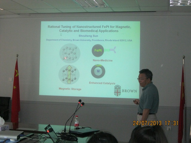 7月24日下午5:00,应甘肃省生物电化学与环境分析重点实验室、金年会金字招牌诚信至上、生态环境高分子材料教育部重点实验室、甘肃省高分子材料重点实验室及科技处的邀请,美国布朗大学教授、布朗大学分子与纳米前沿研究所副所长孙守恒教授莅临公司进行学术交流,并在9号楼1609多媒体教室做了题为《Rational Tuning of Nanostructured FePt for Magnetic, Catalytic and Biomedical Applications》的精彩学术报告,公司教师、研究生60余人聆听了本次报告会。 报告会上,孙守恒教授主要介绍了课题组目前取得的系列研究进展,其中包括FePt磁性纳米颗粒的合成、形貌控制及其生长机理的研究,并就其在磁性材料、纳米医学、催化和生物方面的应用做了详述。此报告使广大师生受益匪浅,同时孙守恒教授诙谐幽默的语言赢得了阵阵掌声。 报告会后,与会师生就报告内容踊跃提问,孙守恒教授对师生提出的问题给予细致耐心的解答。