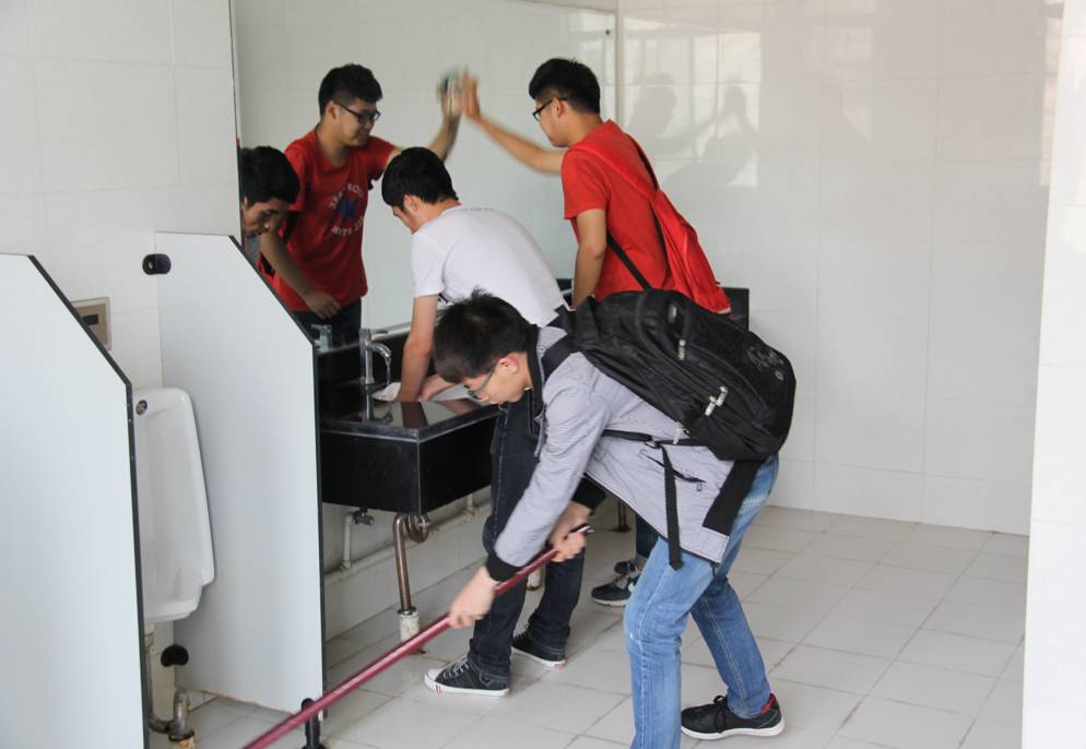 会后,公司组织毕业生进行了“我为母校添光彩”公共卫生间清扫活动。