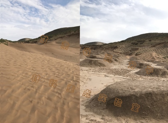 图5土基材料组合沙障分流疏导固定流沙 图6土基材料组合沙障防风蚀和水土流失