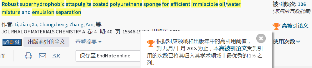 3:Jian Li *, et al, Robust superhydrophobic attapulgite coated polyurethane sponge for efficient immiscible oil/water mixture and emulsion separation, J. Mater. Chem. A, 2016, 4,15546–15553, IF:IF:9.931, SCI一区, ESI高被引论文.