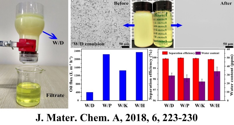 针对膜材料在处理油水乳液时存在通量低、膜表面易污染等问题,近期李健教授等人利用沙漠中的沙子制备了具有油下超亲水性质的沙层,高极性的沙层能够在油环境中吸附油包水乳液中极性的水,即使在沙层孔径大于乳液粒径的条件下,成功的实现了各种油包水乳液的高效分离,其分离效率高达99.99 %。
