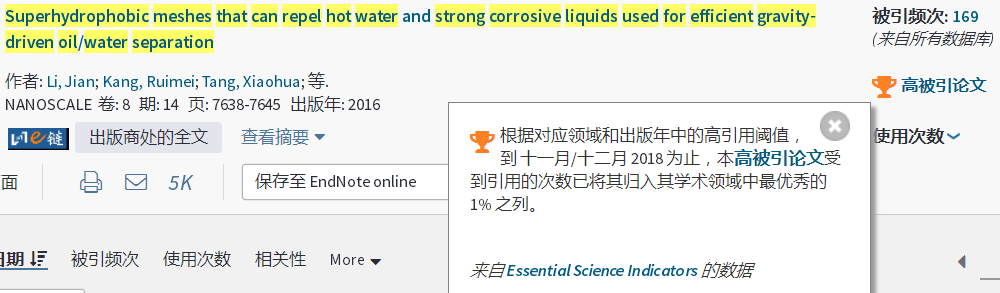 2:Jian Li *, et al, Superhydrophobic meshes that can repel hot water and strong corrosive liquids used for efficient gravity-driven oil/water separation, Nanoscale, 2016, 8, 7638−7645, IF:7.233, SCI一区, ESI高被引论文.