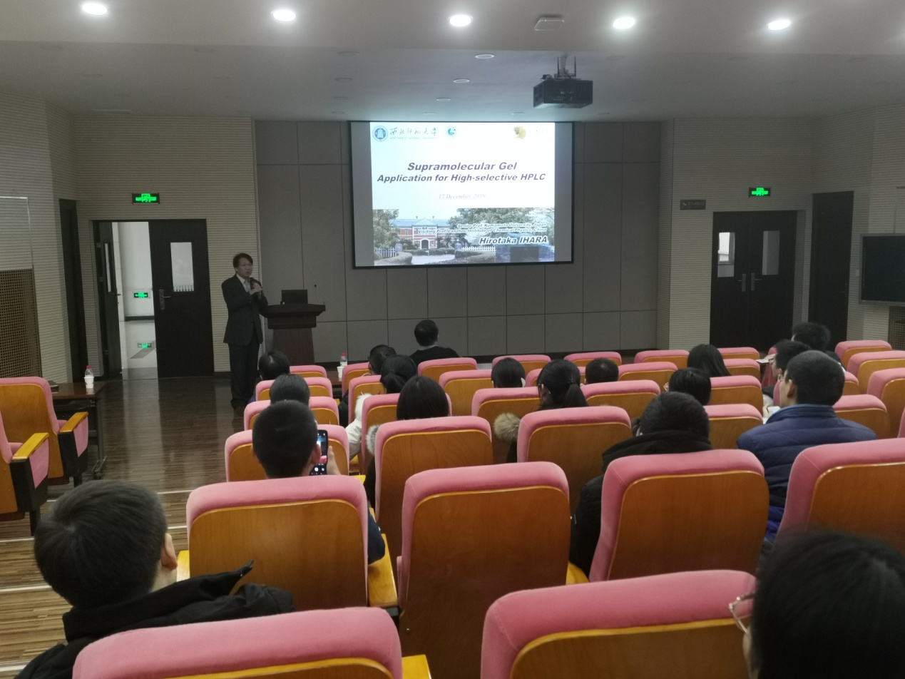 12月17日下午,应金年会金字招牌诚信至上、保水化学功能材料甘肃省国际科技合作基地、甘肃省生物电化学与环境分析重点实验室、生态环境相关高分子材料教育部重点实验室、甘肃省高分子重点实验室邀请,京都大学 Hirotaka IHARA教授教授来公司作题为《Photo-functional Supramolecular Gels》的报告,金年会金字招牌诚信至上教师、研究生100余人在新校区特教楼159教室参加了报告会。报告会由薛中华教授主持。