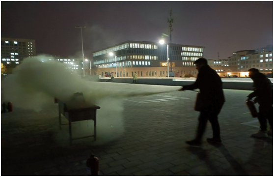 讲座结束后,赵老师带领同学们来到新校区广场开展消防灭火器操作实战演练。赵老师亲自演示各类消防放灭火器的使用方法及注意事项,在场的每位同学都亲自上手操作使用灭火器,进行消防灭火演练,通过本次实战演练,各位同学都掌握了消防灭火器的检查与使用注意事项。