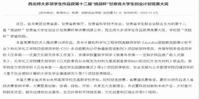 近日,第十二届“挑战杯”甘肃省老员工创业计划竞赛终审决赛成绩公布,公司多项员工作品获奖。