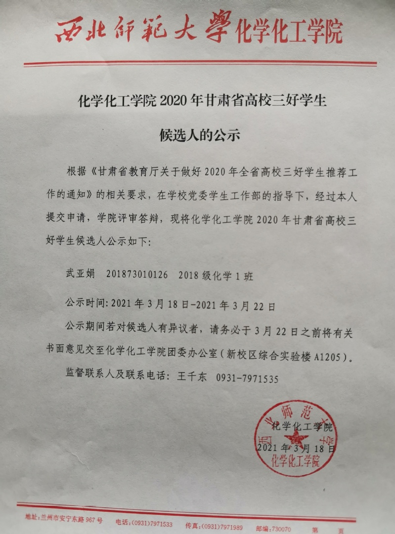 金年会金字招牌诚信至上2020年甘肃省高校三好员工候选人的公示