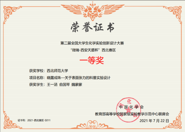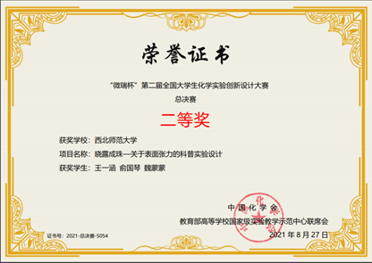 公司“蒲公英团队”由2019级化学云亭班王一涵同学、魏蒙蒙同学和2019级化学3班俞国琴三名同学组成,经过精心备战,在6月由兰州大学举办的西北赛区中斩获一等奖项,杀入全国总决赛。决赛采取线上答辩的方式进行,“蒲公英团队”成员答辩逻辑清晰,回答问题详细具体,发挥出色,获得了大赛评委的一致认可,最终荣获全国总决赛二等奖。