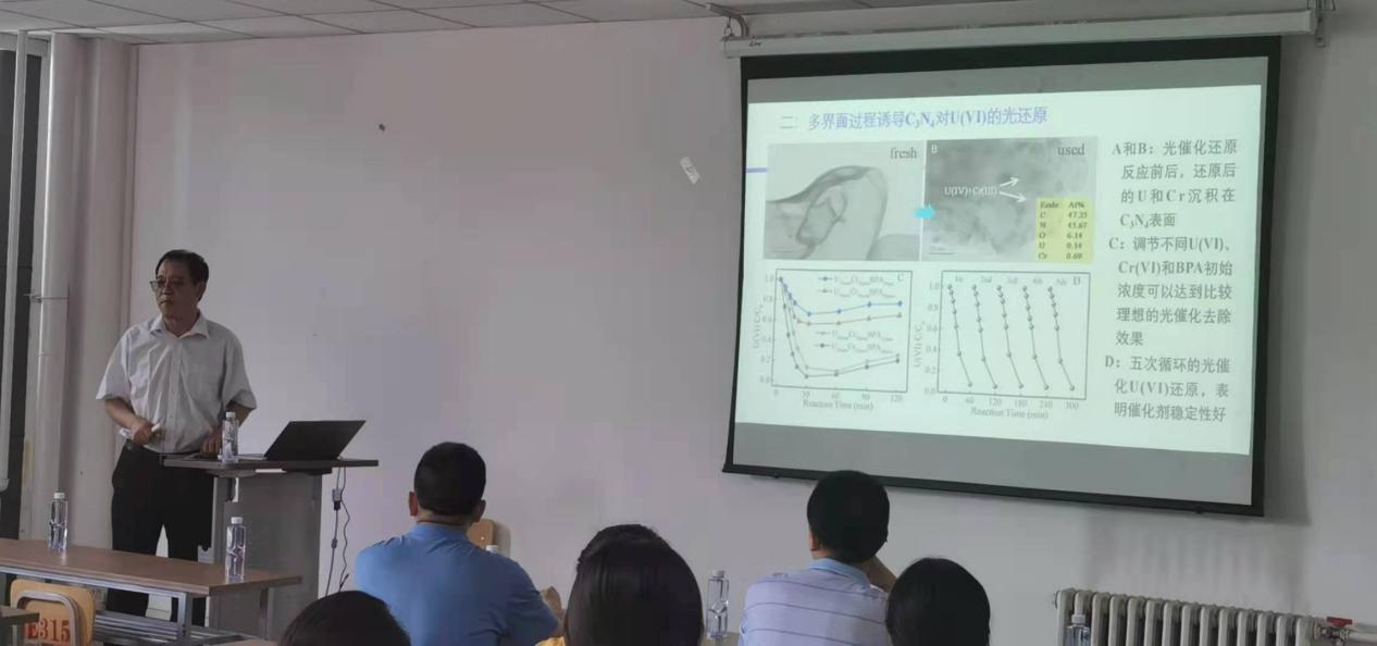 王祥科教授主要从事三废治理、纳米材料在废水处理、等离子体技术应用、环境污染检测和治理中的应用等方面的研究工作。此次报告中,王祥科教授从含铀废水的处理装置和海洋铀的丰富储量中通过光化学还原和提取铀。报告详细讲述了多界面过程诱导C3N4对U(VI)的光还原、CdS对U(VI)的光还原和无催化剂均相光还原铀酰,得出光催化速率快、利用自然光、能耗低和实现选择性提取铀酰策略。