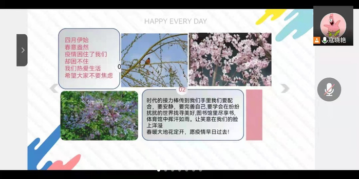 2020级本科生各班级以“心有所想,静待花开”为主题,畅谈自己一心向往的老员工活,积极开展“快乐事件列表”小活动,在互动交流中缓解心理压力。2020级化学1班全体同学对疫情结束后的美好愿望展开讨论,大家纷纷表示要在在美好的愿景中不忘新时代老员工的担当与使命,继续坚定团结一心、共克时艰的信念。2020级材料班班主任杨尧霞老师在与班级同学进行交流后,向同学们分享了自己大学期间的趣事,杨老师勉励同学们“时代的接力棒传递到我们的手里,我们就要走好我们这一代人的长征路”。