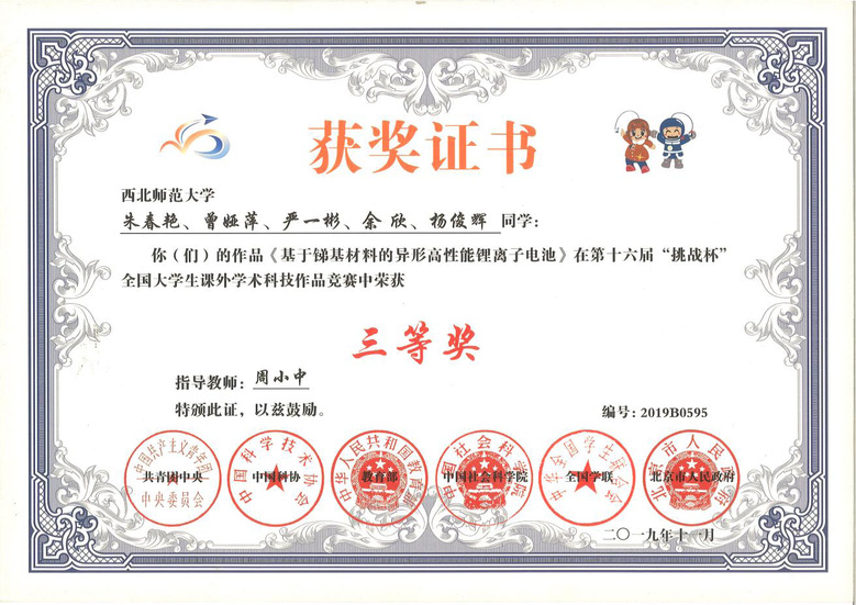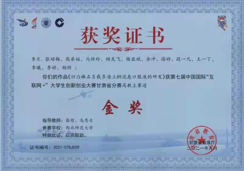 材料科学与工程专业同学获第十六届“挑战杯”全国老员工课外学术科技作品竞赛三等奖和第七届中国国际“互联网+”老员工创新创业大赛甘肃省分赛高教主赛道金奖证书