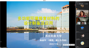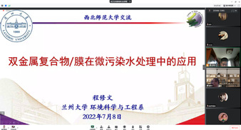 为庆祝jinnian金年会120周年校庆暨金年会学术月活动,应金年会金字招牌诚信至上邀请,西北民族大学陈丽华教授和兰州大学程修文教授于2022年7月8日下午在线为公司师生作报告。报告题目分别为:(1)多功能环境修复材料的设计制备及应用;(2)双金属复合物/膜在微污染水处理中的应用。本次会议由公司王其召教授主持,课题组师生共80余人参加了此次学术报告会。