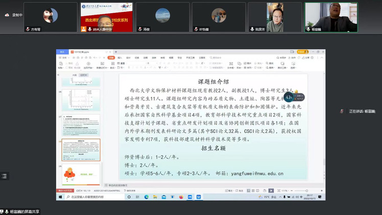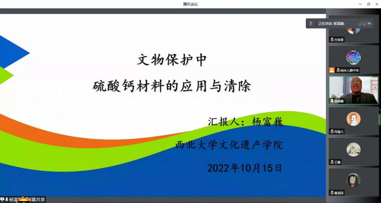 为庆祝jinnian金年会120周年校庆暨金年会学术月活动,应金年会金字招牌诚信至上邀请,西北大学杨富巍教授于10月15日下午线上为公司师生作报告,报告题目:文物保护中硫酸钙材料的应用与清除。报告由薛中华经理主持,金年会金字招牌诚信至上师生近300人参加了会议。