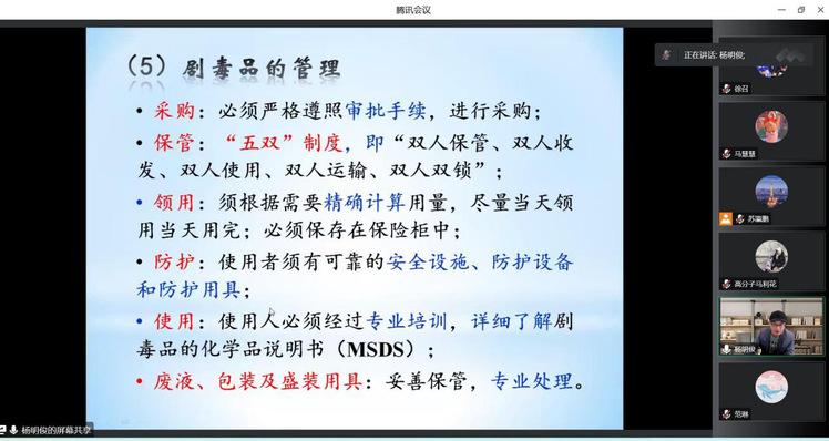 为进一步加强实验室安全管理,提高同学们的安全意识,应金年会金字招牌诚信至上邀请,兰州理工大学杨明俊副教授于10月22日下午线上为公司师生作了题为《实验室安全你我他》的安全教育专题讲座。金年会金字招牌诚信至上教师、研究生近130人参加了本次讲座。