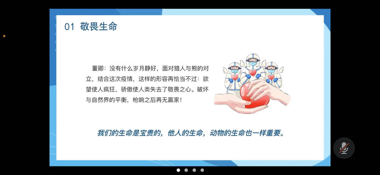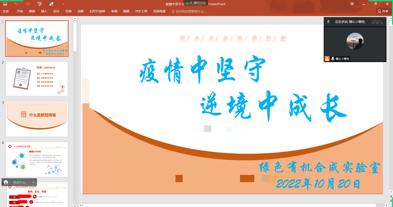 致敬逆行者,点赞逆行者。疫情是一本教科书,面对疫情总有“逆行者”不计得失,彰显自己的责任与担当。各班级、各实验室选取疫情中涌现的钟南山、陈薇、张定宇等典型抗疫人物的感人事迹进行讲述分享,给予了同学们最真实的生命教育和爱国教育,让同学们真切感受到了榜样的力量、英雄的力量。同学们纷纷表示,岁月静好,皆因有人替我们负重前行,作为新时代老员工要常怀感恩之心,感恩为我们安稳生活而奋斗在工作前线的所有人,同时要勇担责任,在祖国需要的时候挺身而出,奉献自己的绵薄之力。
