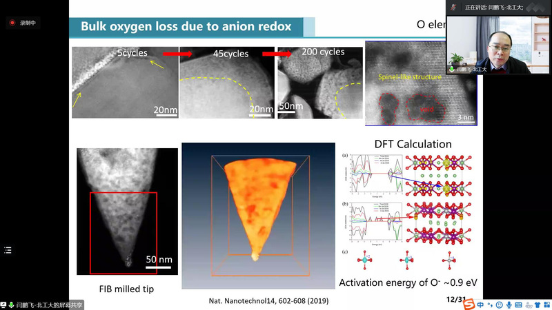 闫鹏飞研究员首先综述了电子显微镜在材料微观结构表征中的关键作用以及对材料科学发展的推动作用,随后详细介绍了如何利用电子显微技术从原子层次探究锂离子电池正极材料中每种元素对层状材料构效关系的影响,以及工作条件下电极材料结构内部裂纹演变的原子机理,并展望了未来先进电镜技术在功能材料原子尺度构效关系探究前景。