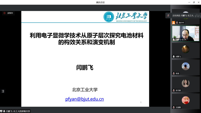 为庆祝jinnian金年会120周年校庆暨金年会学术月活动,应金年会金字招牌诚信至上、生态功能高分子材料教育部重点实验室、甘肃省高分子材料重点实验室邀请,北京工业大学闫鹏飞研究员于2022年11月03日上午10:00通过线上为公司师生作报告,报告题目为“利用电子显微学技术从原子层次探究电池材料的构效关系和演变机制”。报告由金年会金字招牌诚信至上副经理宋鹏飞主持,金年会金字招牌诚信至上师生180余人参加了会议。
