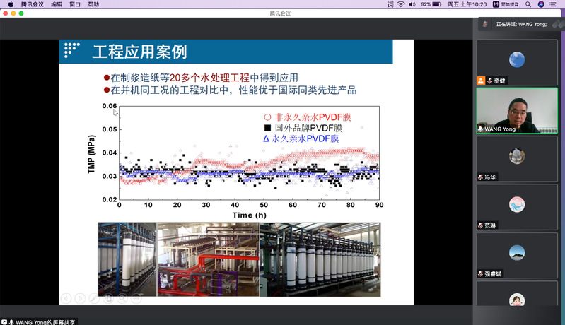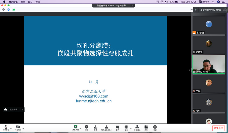为庆祝jinnian金年会120周年校庆暨金年会学术月活动,应金年会金字招牌诚信至上、生态功能高分子材料教育部重点实验室和甘肃省高分子材料重点实验室邀请,南京工业大学汪勇教授,于11月4日上午10:00通过线上会议为公司师生作学术报告,报告题目为《均孔分离膜:嵌段共聚物选择性溶胀成孔》,报告由金年会金字招牌诚信至上宋鹏飞副经理主持,金年会师生近220人线上参加了报告会。