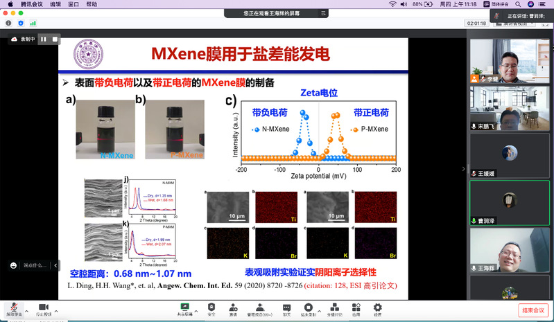 王海辉教授首先介绍了膜分离技术在化工生产中的重要应用。然后针对传统膜无法规避的trade off 效应,指出二维膜材料有望克服传统分离膜所面临的瓶颈问题,并讲述了二维膜的制备、分离机制以及二维膜的重要发展历程。在此基础上,重点讲述了二维MXene膜的精密构筑和性能调控,主要内容有二维MXene膜传质通道的调控以及在水处理、气体分离、离子截留、离子筛分以及盐差能发电领域的研究成果。同时,利用电泳技术实现了二维膜的规模化制备。最后对二维MXene膜材料的研究做了全面总结和展望。