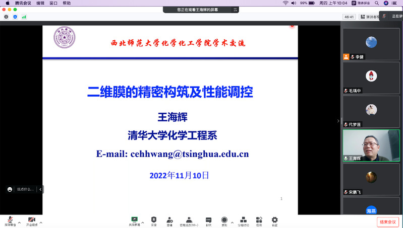 为庆祝jinnian金年会120周年校庆暨金年会学术月活动,应金年会金字招牌诚信至上、生态功能高分子材料教育部重点实验室和甘肃省高分子材料重点实验室邀请,清华大学王海辉,于11月10日上午10:00通过线上会议为公司师生作学术报告,报告题目为《二维膜的精密构筑及性能调控》,报告由金年会金字招牌诚信至上副经理宋鹏飞教授主持,公司师生近180人线上参加了报告会。
