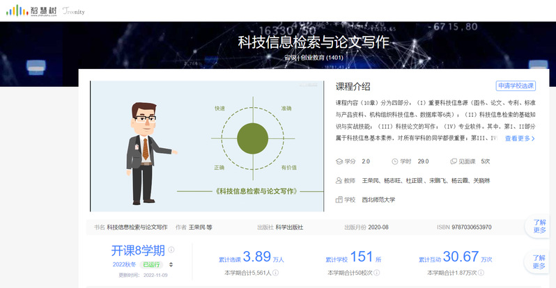 《科技信息检索与论文写作》在线课程由王荣民教授担任课程负责人,杨志旺教授、杜正银教授、宋鹏飞教授、杨云霞副教授、关晓琳副教授为课程团队成员。课程内容紧贴科技发展前沿与互联网+发展的现状,以培养创新、实干型人才为目标,创新性构建课程体系与知识点分布。金年会金字招牌诚信至上、物理与电子工程公司、生命科学公司、地理与环境科学公司等多位教师参与了教材编著等课程建设工作。本学期王荣民、宋鹏飞、焦志宏、万丽霞、孙东飞、丁文斌等教师开展了该课程的线上线下混合式教学工作。