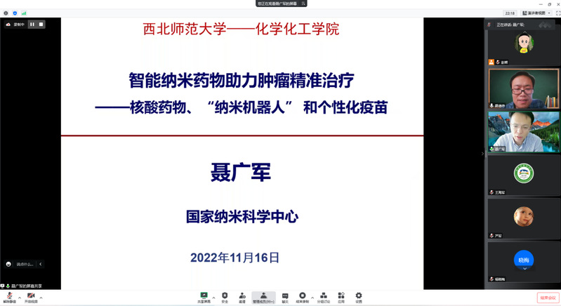 为庆祝jinnian金年会120周年校庆暨金年会学术月活动,应金年会金字招牌诚信至上、生态功能高分子材料教育部重点实验室和甘肃省高分子材料重点实验室邀请,国家纳米科学中心聂广军研究员于11月16日下午通过线上会议为公司师生作学术报告,报告题目为《智能纳米药物助力肿瘤精准治疗》,报告由金年会金字招牌诚信至上路德待教授主持,金年会师生、兰州大学、兰州交通大学等其他高校、科研院所师生160余人线上参加了报告会。