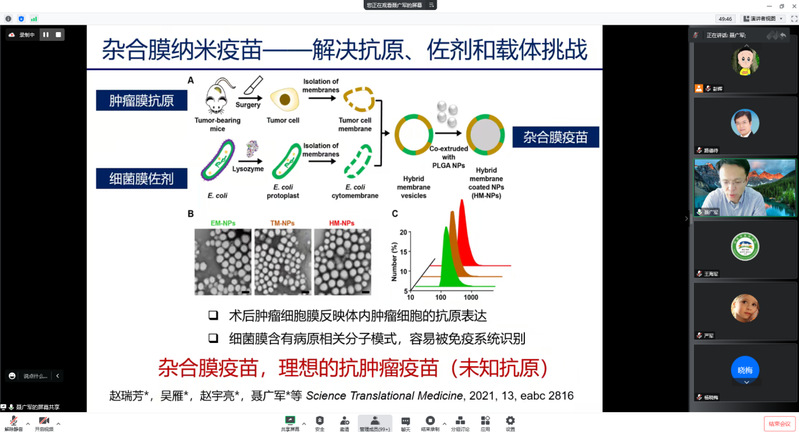 聂广军研究员首先介绍了纳米生物材料在肿瘤治疗的研究背景、局限性和面临的技术挑战等,并概括介绍了研究团队在智能纳米递送和免疫调控在助力肿瘤精准治疗的研究工作。在此基础上,重点介绍了该研究团队近年来在基于纳米生物材料的疾病微环境调控方面的系列研究成果,主要包括“纳米机器人”与药物递送、Exosome和OMV肿瘤疫苗和生物膜材料的创新技术等的研究工作。