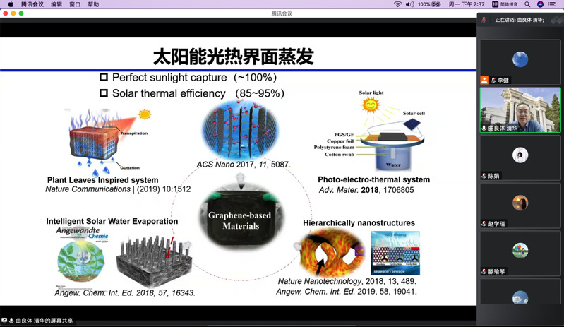 由于石墨烯及其宏观结构的物理和化学特性依赖于其可控组装与功能化修饰,进而影响其特定应用。曲良体教授展示了新的方法和技术如限域组装等,实现可不同维度功能石墨烯的制备。基于这些维度限定的功能结构,在能源与环境领域表现出独特的应用潜能。曲良体教授首先对太阳能光热界面蒸发做了详细介绍,讲解了三维结构的石墨烯有序组装结构具有高效光热转化效能,在光热产生清洁水方面具有重要应用前景。然后曲良体教授分别介绍石墨烯衍生的功能组装材料在能源与环境领域前沿应用的其他例子。例如,通过微结构调控的石墨烯可以作为高性能的储能电极材料;特殊处理的石墨烯可作为产电材料,一旦遇到湿气便自发产生电能。最后对此研究做了全面总结和展望。