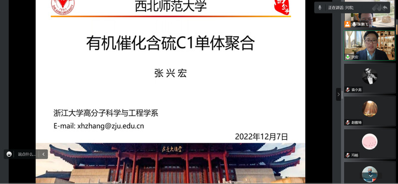 为庆祝jinnian金年会120周年校庆暨金年会研究生学术月活动,应金年会金字招牌诚信至上、保水化学功能材料甘肃省国际科技合作基地、生态功能高分子材料教育部重点实验室和甘肃省高分子材料重点实验室邀请,浙江大学张兴宏教授于12月7日上午通过线上会议为公司师生作报告,报告题目为《有机催化含硫C1单体聚合》,报告会由宋鹏飞教授主持,金年会金字招牌诚信至上师生近100余人线上参加了报告会。