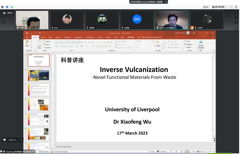 2023年3月17日下午,应金年会金字招牌诚信至上和保水化学功能材料甘肃省国际科技合作基地邀请,英国利物浦大学化学系吴晓锋研究员通过线上会议为公司师生作了题为《逆硫化聚合反应》的科普报告。报告由宋鹏飞教授主持,公司师生120余人参加了此次线上报告会。