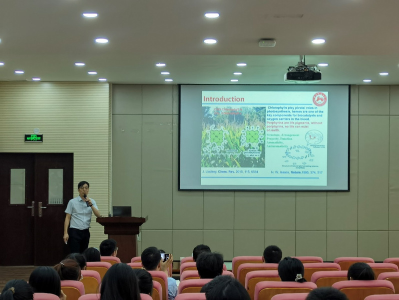 卟啉与生命科学密切相关,卟啉化合物广泛存在于自然界的生命体中,对生命活动起着重要作用。叶绿素、血红素、维生素B等都可以看作是金属卟啉类化合物,它们在生命过程中,对氧的传递(血红蛋白)、贮存(肌红蛋白)、活化(细胞色素p450)和光合作用(叶绿素)等起着十分重要的作用。宋建新教授课题组长期致力于新型卟啉衍生物的合成以及性能研究。在报告中,宋建新教授详细介绍了团队近年来在卟啉纳米分子、卟啉类似物的设计、合成与性能研究等方面的研究工作。通过发展卟啉类功能分子的合成方法以及开发新颖卟啉功能分子的构筑模块,合成了系列结构新颖、性能特异的卟啉类功能分子。
