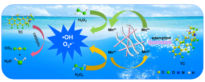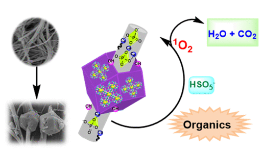 其次,采用原位溶剂热法成功合成了一种纤维无机纳米复合材料MnOOH-羟基磷灰石纳米线(MnO-HApNWs)(Scheme 8)。并将其应用于抗生素的降解,在提升降解率的同时,还提高了材料的循环稳定性。基于纳米结构表征、关键参数影响、活性物质测定和降解中间体分析,研究了催化降解的机理和降解途径。发现MnO-HApNWs的高比表面积和孔径有利于TC吸附在其表面,并通过生成活性氧催化降解。所制备的新型纤维无机纳米复合材料(MnO-HApNWs)具有优异的催化性能,在废水污染物去除方面具有广阔的应用前景。成果以论文“Synthesis of MnOOH-hydroxyapatite nanowires for degradation of tetracycline”发表在Journal of Environmental Chemical Engineering, 2023,11: 111577(工程技术2区,IF:7.7);赵胜兰和周梅玲为共同第一作者(硕士研究生)。另一篇“Construction of CoMOF@HAnW Moniliform-like Heterojunction for Effective Catalytic Degradation of Organics”发表在ACS Applied Nano Materials, 2021, 4(9): 9370-9381(工程2区,IF:6.140)(Scheme 9);李伯珍为第一作者(硕士研究生)。