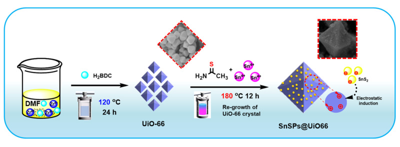 首先,充分利用MOFs材料中UiO66具有高比表面积、大孔隙率、高热稳定性、化学稳定性、优异的水中结构稳定性和显着的强酸性、中等碱度的耐受性等特点,通过简单的水热反应构筑了一种高光催化活性的杂合体异质结材料,为医疗废水的光催化处理提供了一种新思路。通过将UiO66分散到SnSPs的前驱体溶液中,在水热反应过程中经过静电诱导自组装构建杂合体异质结材料(Scheme 6)。将其应用于医疗废水抗生素的降解,探讨了SnSPs@UiO66杂合体的光降解机理。发现所制备的光催化材料不但具有高的催化活性,而且可循环使用。成果以论文“Constructing nano-heterojunction of MOFs with crystal regrowth for efficient degradation of tetracycline under visible light发表在Journal of Alloys and Compounds, 2022, 904, 164061(材料科学2区;IF:6.2);曹培宇(硕士研究生)和张亚苹(博士研究生)为共同第一作者。另一篇“Construction of UiO-66@Flower-like MoS2 hybrids through electrostatically induced self-assembly with enhanced photodegradation activity towards Lomefloxacin Chemosphere”发表在Separation and Purification Technology, 2021, 265: 118486(工程I区,IF:7.312);高娣(硕士研究生)和张亚苹(博士研究生)为共同第一作者。