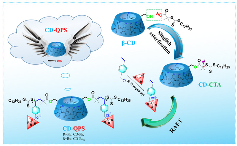 首先,以季磷盐离子液体(QPSIL)和β-环糊精(β-CD)为原料,通过Steglich酯化和可逆加成-断裂链转移聚合(RAFT)合成了双臂抗菌聚合物(CD-QPS)(Scheme 1)。评价了其对大肠杆菌和金黄色葡萄球菌的抗菌活性,讨论了其抗菌机制,考察了水果的长期抗菌效果并测试了其细胞毒性。发现CD-QPS对大肠杆菌和金黄色葡萄球菌表现出优异的抗菌活性,有望作为新一代抗菌剂具有很大的潜力。该成果以论文“Poly(phosphonium)-Functionalized Double-Armed β‑CD Antimicrobial Material via RAFT”发表在Macromolecules, 2023, 56: 9498−9508(化学1区,IF:5.5);孙祥斌和曹芃为共同第一作者(博士研究生)。另一篇论文“Nano-assemblies of phosphonium-functionalized diblock copolymers with fabulous antibacterial properties and relationships of structure-activity”发表在Journal of Materials Chemistry B, 2022, 10(44): 9202-9215.(工程2区,IF:7);第一作者为曹芃(博士研究生)。