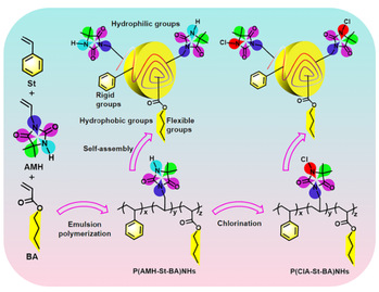 其次,采用浸渍UV光引发聚合法制备了由两性单体、阴离子单体和季铵盐阳离子单体组成的多功能两性离子抗菌水凝胶涂层(PZG)(Scheme 2)。评价了PZG对大肠杆菌和金黄色葡萄球菌的抗菌活性、并考察了PZG的力学性能、自粘附性能和自修复性能。发现PZGs中存在静电相互作用、偶极-偶极相互作用、氢键和共价键,使涂层具有优异的力学性能、自粘附性能和自修复性能。此外,其对大肠杆菌和金黄色葡萄球菌表现出显著的抑菌活性。因此,PZG是一种具有良好自粘自愈功能的抗菌水凝胶涂层,在生物材料和医学领域具有潜在的应用价值。该成果以论文“Highly Adhesive and Self-Healing Zwitterionic Hydrogels as Antibacterial Coatings for Medical Devices”发表在Langmuir, 2024, 40, 125−132(化学2区,IF:3.9);刘晓晴和孙祥斌为共同第一作者(博士研究生)。另一篇论文“Tri-cationic copolymer hydrogels with adjustable adhesion and antibacterial properties for flexible wearable sensors”发表在Journal Materials Chemistry C, 2023, 11: 6451-6458(材料科学2区,IF:6.4);孙祥斌和刘晓晴为共同第一作者(博士研究生)。“N-halamine terpolymer antibacterial nanohemisphere with amphiphilic and rigid-flexible groups”发表在European Polymer Journal, 2023, 200: 112535(化学2区,IF:6.0)(Scheme 3);李军和黄鹏为共同第一作者(硕士研究生)