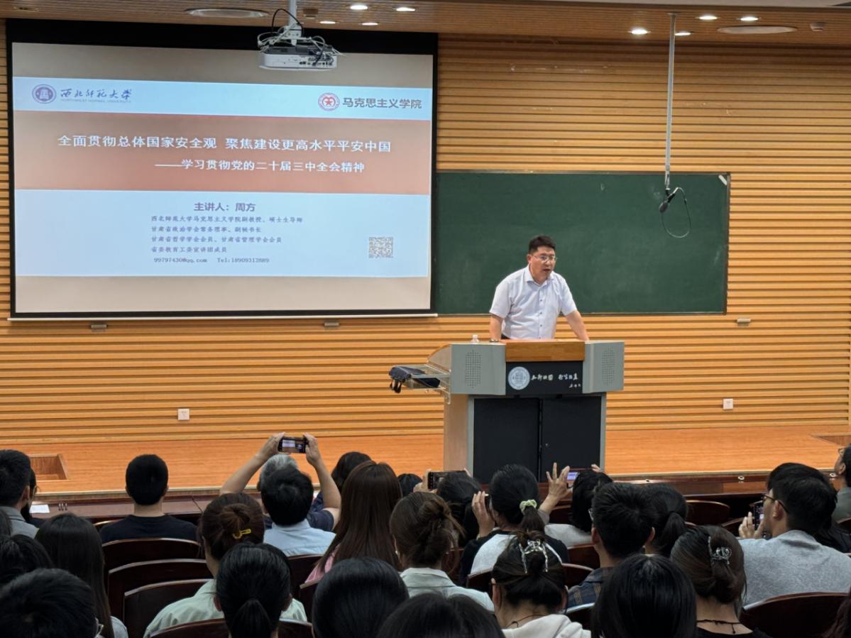 周方老师以“全面贯彻总体国家安全观 聚焦建设更高水平平安中国”为题阐释了总体国家安全观的思想内涵、建设更高水平平安中国的战略意义、显著成就、基本要求与重点任务,对于全面深入理解党的二十届三中全会精神,牢牢把握进一步全面深化改革的总体目标,指导师生党员坚持总体国家安全观,准确把握国家安全形势变化新特点新趋势,深刻理解推进国家安全体系和能力现代化具有重要指导意义。
