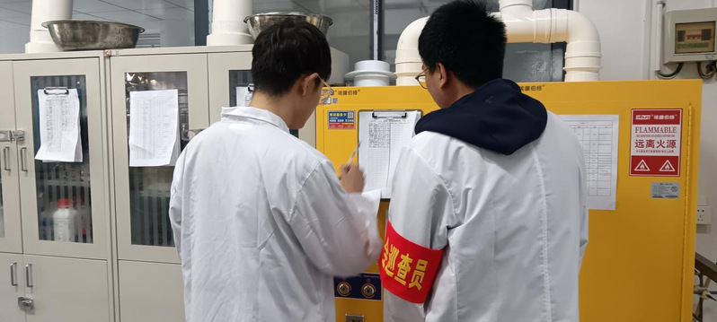 在公司各有机实验室内,党员们手持检查表,对实验室的每一个角落进行了仔细的检查。他们不仅检查了实验台面的清洁度,还特别关注了试剂瓶的摆放是否整齐、仪器设备的维护是否到位以及实验室的通风和照明情况。