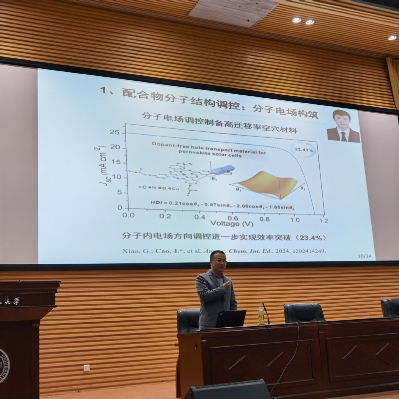 报告中,曹靖教授分享了自己在jinnian金年会求学期间的学术成长经历,以及这段经历对他后期发展的积极影响。详细介绍了课题组近几年的工作重点,阐述了如何通过“分子内结构设计”和“分子间作用优化”策略对材料表界面的结构进行调控,从而提升钙钛矿太阳能电池的性能。