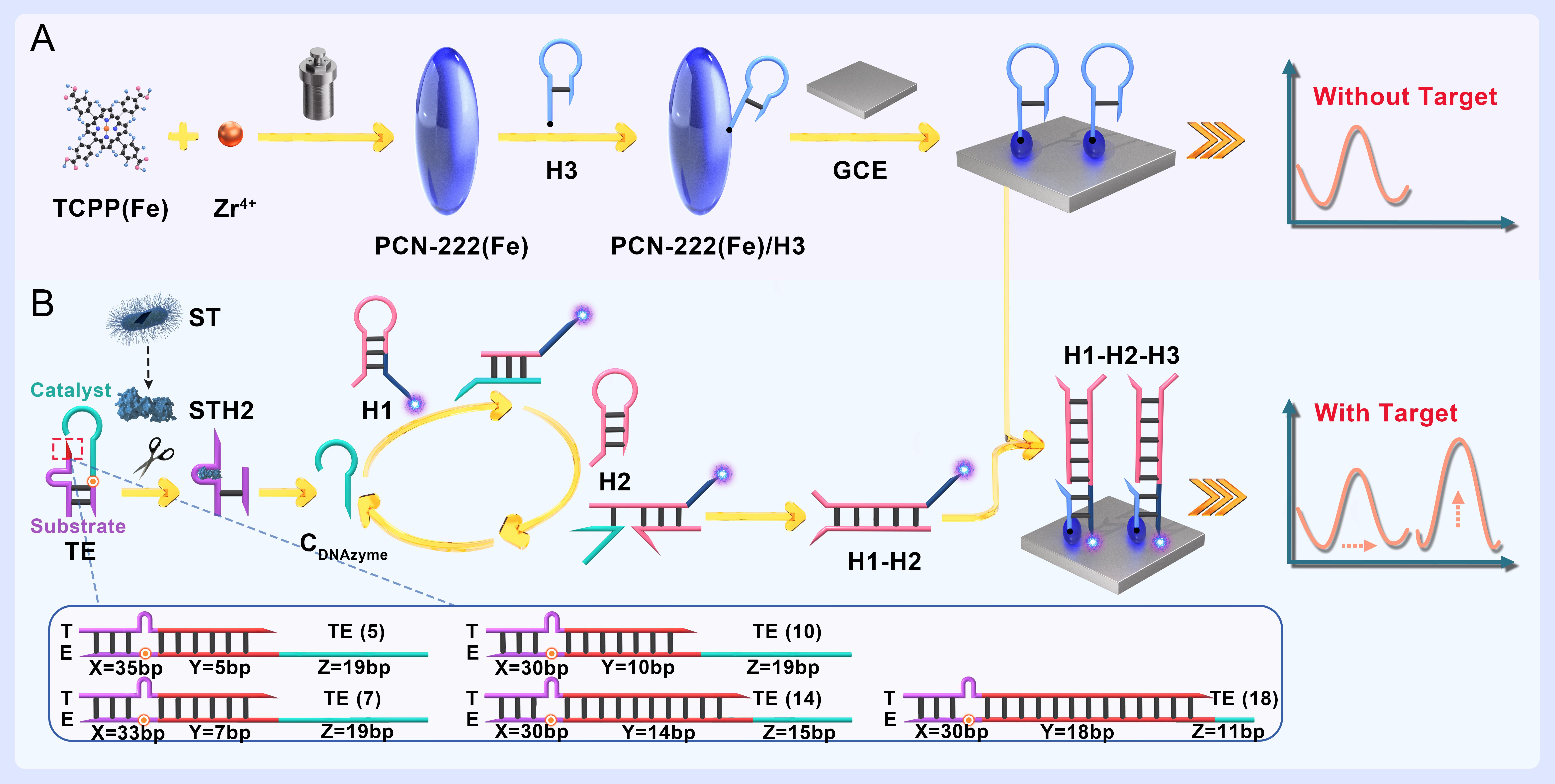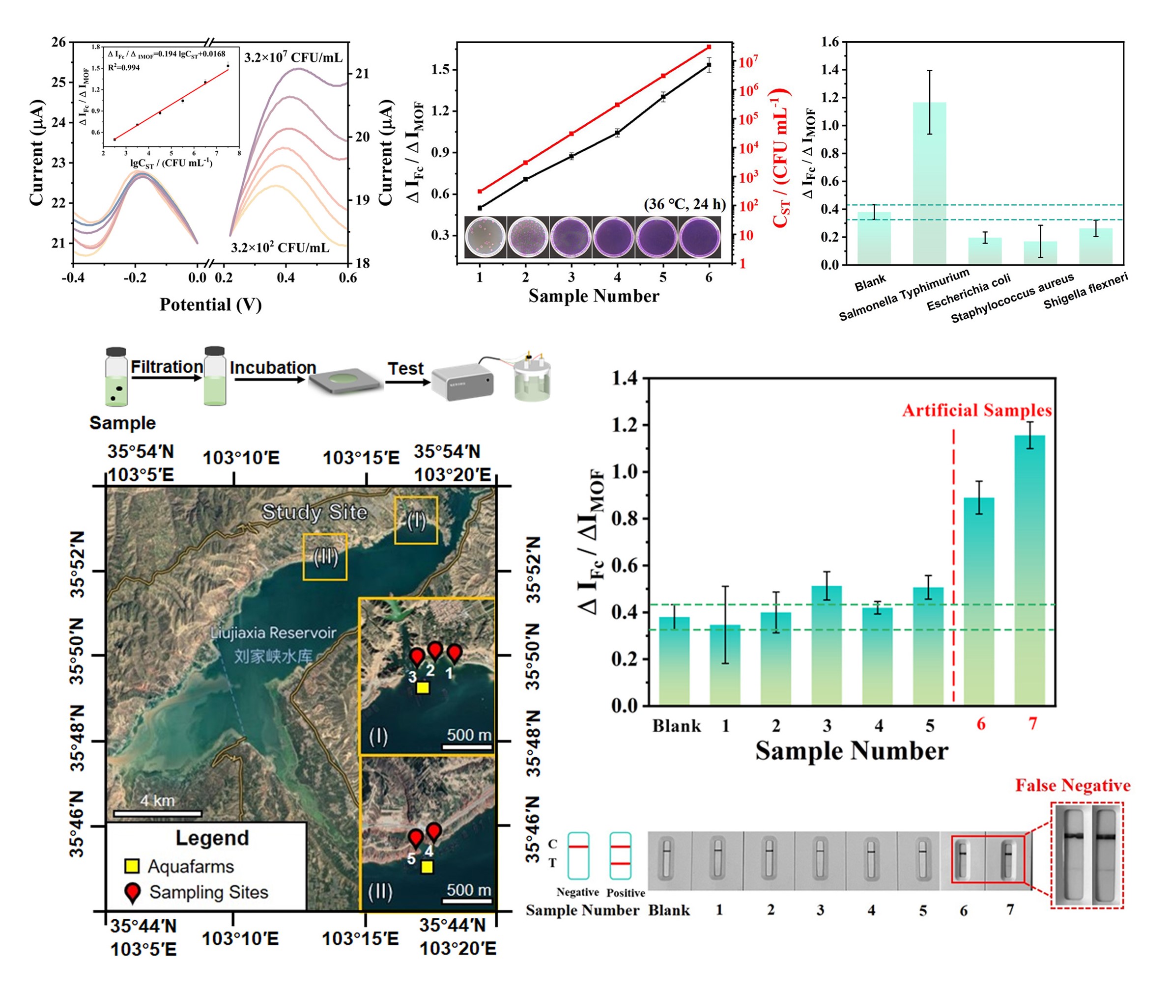 水中生物性污染已成为环境安全和人类健康的重要威胁。沙门氏菌作为一种常见的食源性、水源性致病菌,可通过污染环境水体引发群体性感染,严重威胁公共健康安全。传统检测方法依然存在诸多局限,如细菌培养法耗时长、PCR技术依赖复杂仪器及专业操作,难以满足沙门氏菌的快速、灵敏、现场分析需求。因此,急需开发一种灵敏、快速的方法来特异性检测水中的沙门氏菌。近日,卢小泉、祝振童团队报道了一种新型无酶扩增比率电化员工物传感平台,用于灵敏、快速、现场定量检测城市水源中的鼠伤寒沙门氏菌。该方法通过DNAzyme选择性识别诱导引发,结合下游催化发夹DNA组装(CHA)的目标特异性组装扩增,使传感器对活体鼠伤寒沙门氏菌在3.2×102-3.2×107 CFU/mL范围内表现出良好的线性关系,检测限为489 CFU/mL。该传感器对于检测沙门氏菌具有良好的选择性和重现性,对于不同pH、离子强度特点的环境水体均保持较好的稳定性。最后,作者将构建的传感器应用于城市上游水源地刘家峡库区和黄河兰州段流域中沙门氏菌的实际水样检测,结果不仅与金标准细菌培养法相一致,而且表现出比商用试纸条更高的灵敏度,证明了该基于功能核酸自组装的无细胞生物传感体系的可行性和应用潜力。
