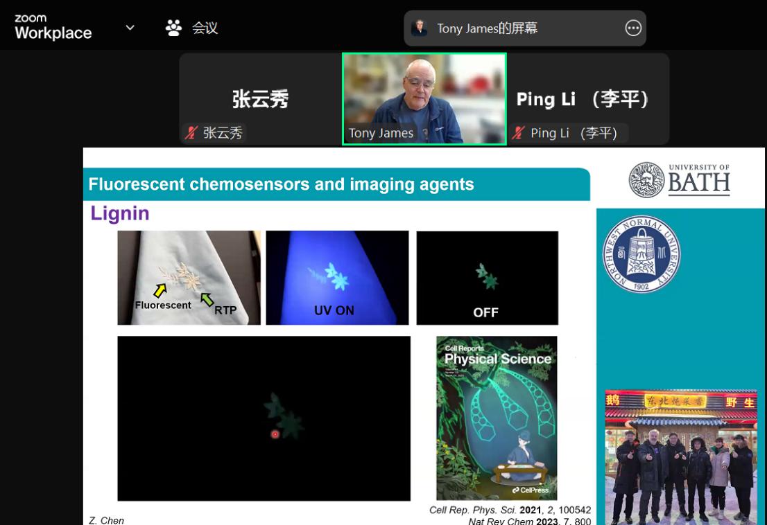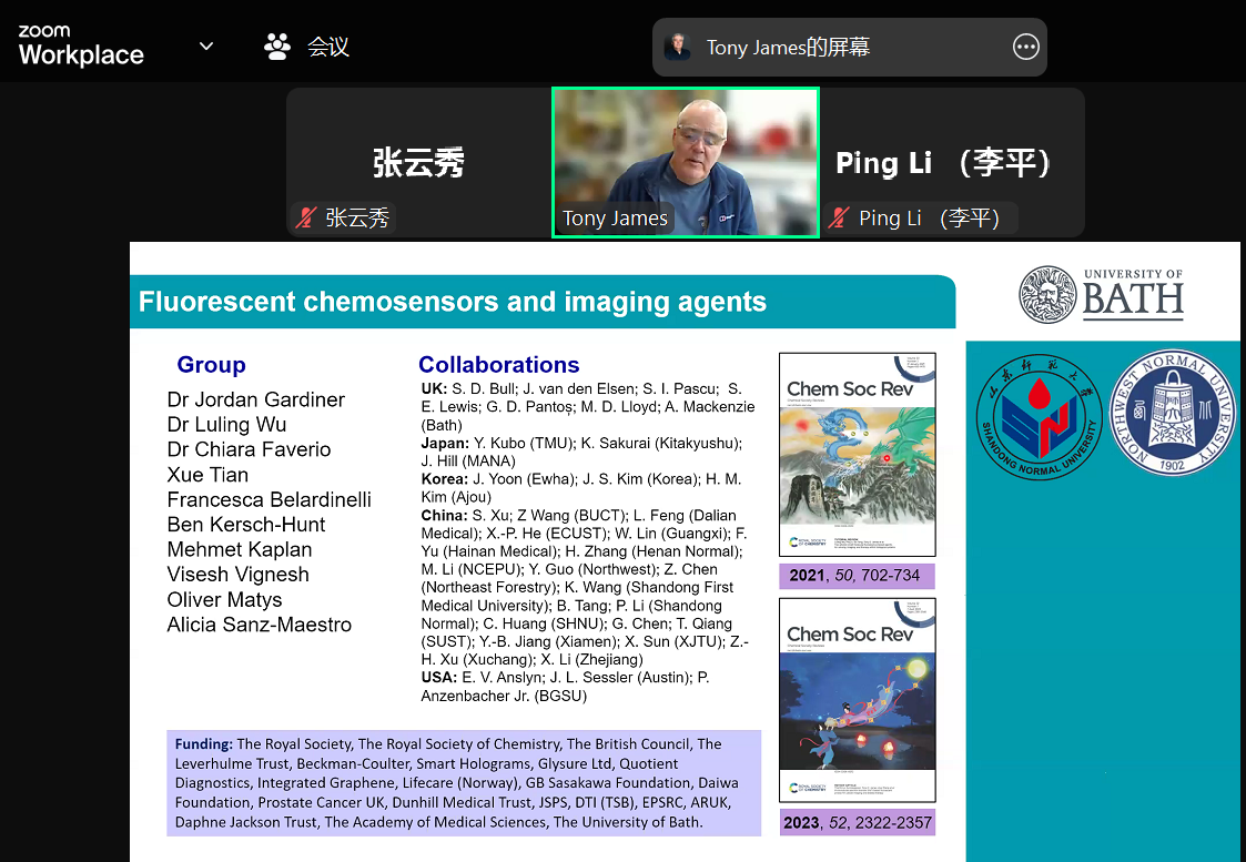 2025年4月17日,英国巴斯大学Tony D. James教授应邀为公司师生在线作学术报告,题目为《Fluorescent Chemosensors: the Past, Present and Future》。公司师生80余人参加了此次报告学术会,会议由公司李平教授主持。