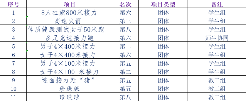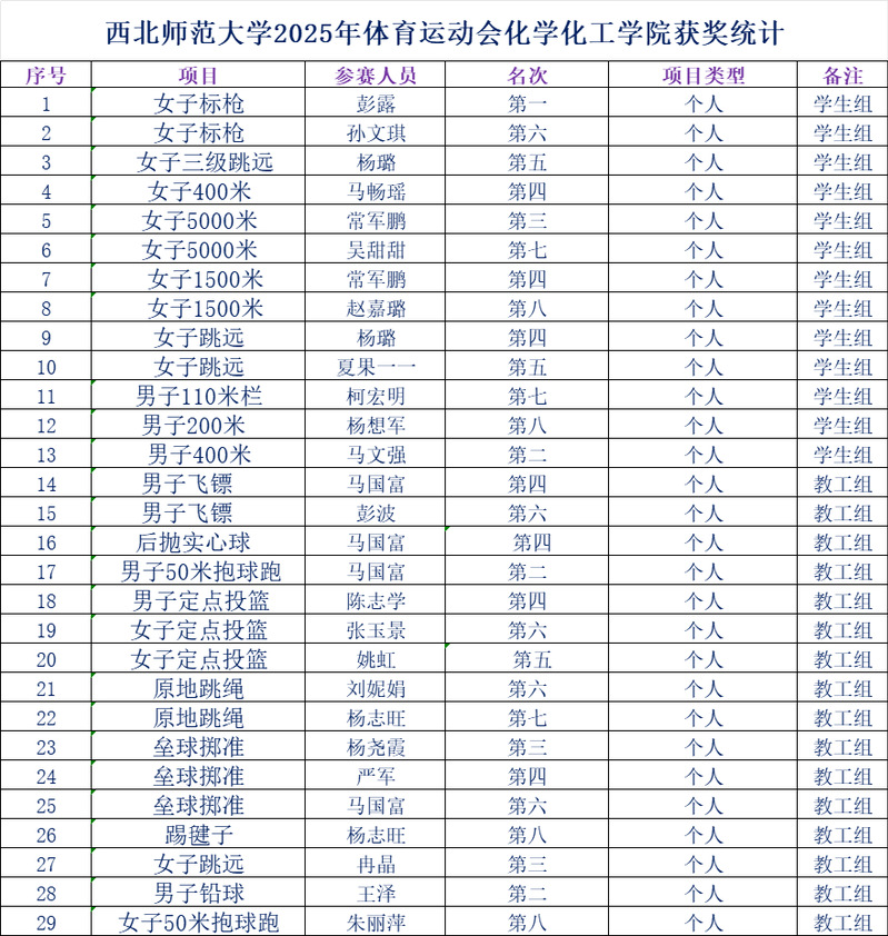 在个人项目中,公司师生同样捷报频传。彭露同学以卓越表现斩获女子标枪第一名;马文强、杨想军在短跑与中长跑项目中突破极限,分别获男子400米第二名、男子400米第八名;教工组马国富老师稳健发挥,在男子飞镖、后抛实心球、50米抱球跑、垒球掷准等多个项目获得奖项。此外,多名师生在跳远、铅球等项目中崭露头角,用汗水书写了“更高、更快、更强”的体育精神。