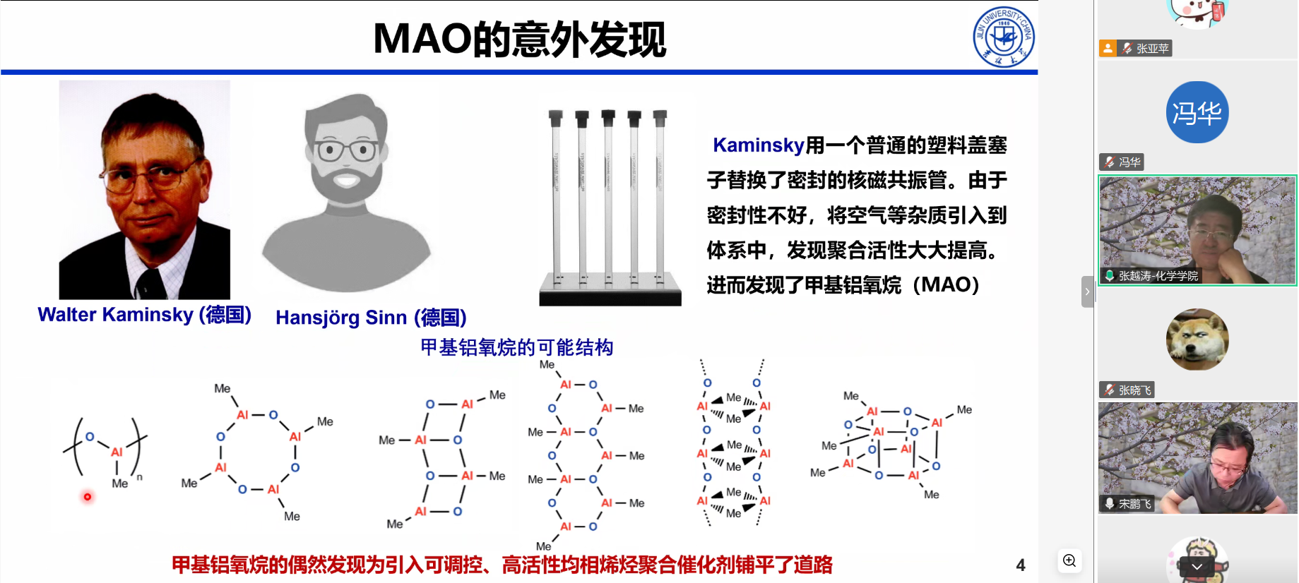 报告中,张教授在从偶然发现到创新的研究进展汇报,展示了二氧化碳环状聚合物、受阻Lewis酸碱对催化聚合、聚乳酸立构规整性的精准设计三个方面的重要工作。重点阐释了如何从偶然发现中发现有价值的科研工作,如何分析实验的偶然结果,特别是飞行时间质谱测试表征聚合物信息,进而为新型聚合物结构和功能的精准调控提供借鉴。张教授告诉大家,与众不同的不是失败,而是偶然发现,是创新的发端,但需要大家进行认真分析,勤于观察,善于思考和总结。